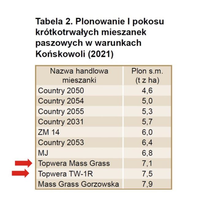 Lubelski Ośrodek Doradztwa Rolniczego w Końskowoli opublikował w „Lubelskich Aktualnościach Rolniczych” wyniki badań plonowania mieszanek traw paszowych krótkotrwałych. Znakomite wyniki odnotowały mieszanki Topwera: Mass Grass i TW-1R. Jedynie Mass Grass Gorzowska okazała się konkurencyjna dla mieszanek Topmleko.